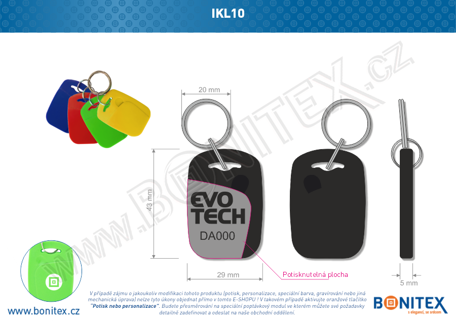 ABS klíčenka s bezkontaktním RFID čipem, rozměru 44x30 mm a tloušťky 4,2 mm, vhodná například pro přístupové, identifikační, docházkové a jídelní systémy. V případě zájmu o provedení POTISKU či PERSONALIZACE nás kontaktujte kliknutím na ikonu se stejným pojmenováním. Klíčenku lze personalizovat/potisknout např. logem společnosti, sériovým číslem, UID čipu.