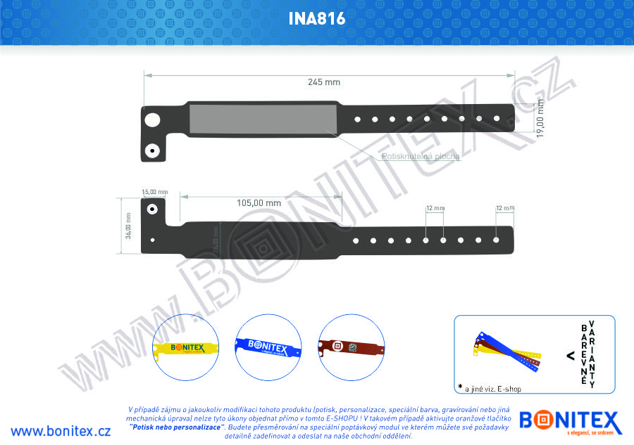 Jednorázový vinylový identifikační náramek, rozměru 245x19/25 mm, vhodný například k identifikaci osob v nemocnicích, sportovních zařízeních, na stadionech, koncertech a jiných společenských akcí.
