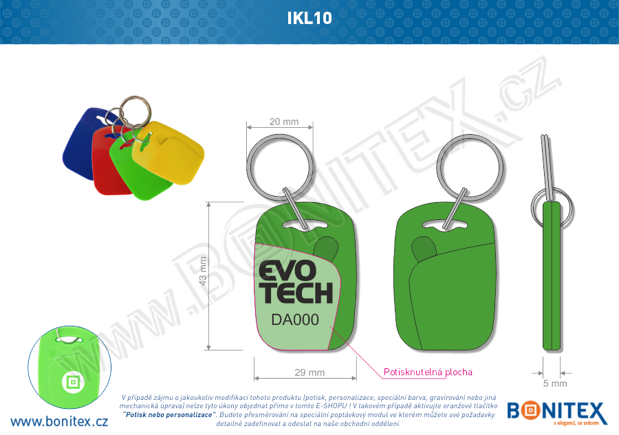 ABS klíčenka v zeleném provedení s bezkontaktním RFID čipem na frekvenci 13,56 MHz je vybavena spolehlivým čipem NXP-Mifare S50(1k)-4b. S rozměry 44x30 mm a tloušťkou 4,2 mm poskytuje spolehlivou identifikaci a zabezpečení. Ideální pro přístupové, identifikační, docházkové a jídelní systémy.