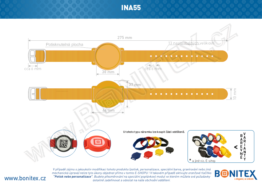 Jeden z nejpoužívanějších a nejprodávanějších náramků, INA55, je výbornou volbou pro mnoho aquacenter. Tento oranžový nylonový identifikační náramek o rozměrech pásky 255/265 x 17 mm je vybaven kovovou sponou a RFID čipem NXP-Mifare S50(1k)-4b. Náramek má specifické rozměry, které se vejdou do většiny automatizačních jednotek pro bezobslužné vrácení náramků. Je ideální pro použití v přístupových a identifikačních systémech v aquaparcích, bazénech a saunách.